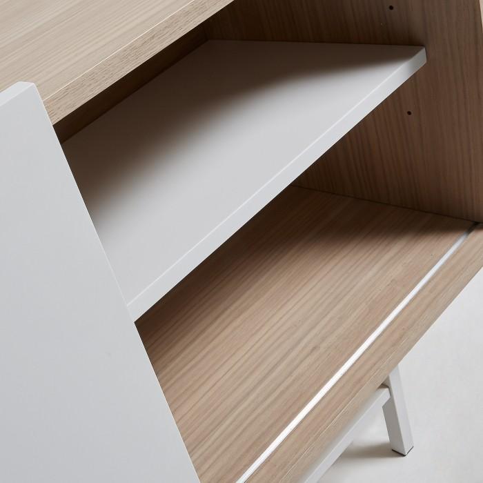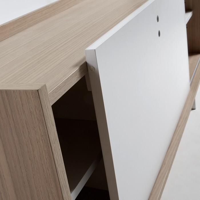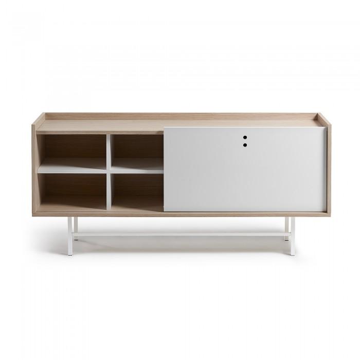 Aparador con estructura de chapa de roble natural. Puerta corredera en DM lacado blanco mate. Pies en metal pintado.