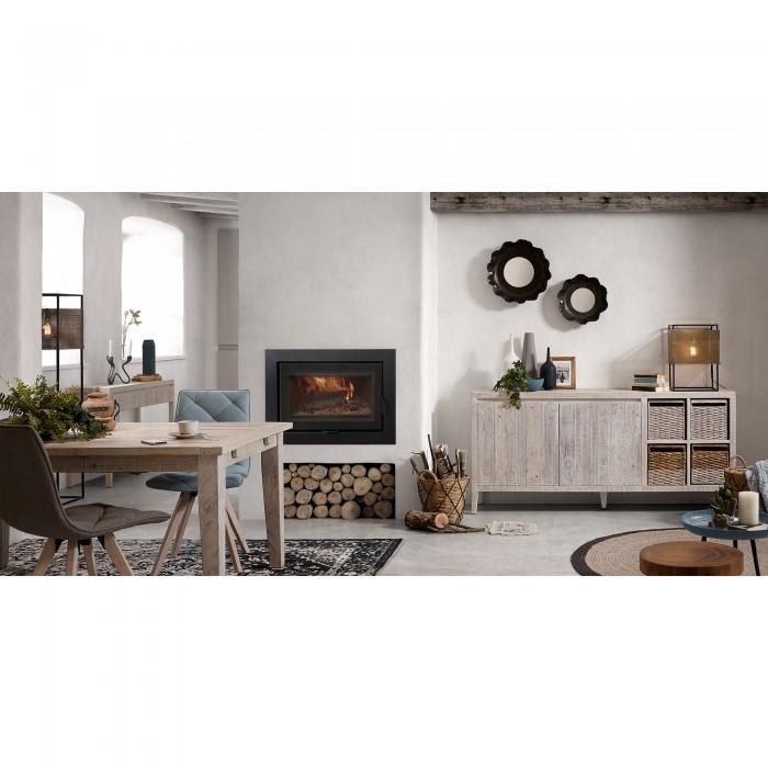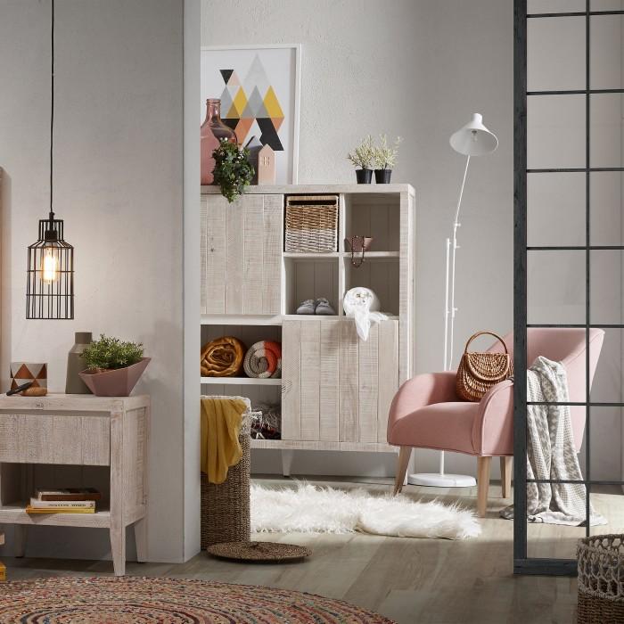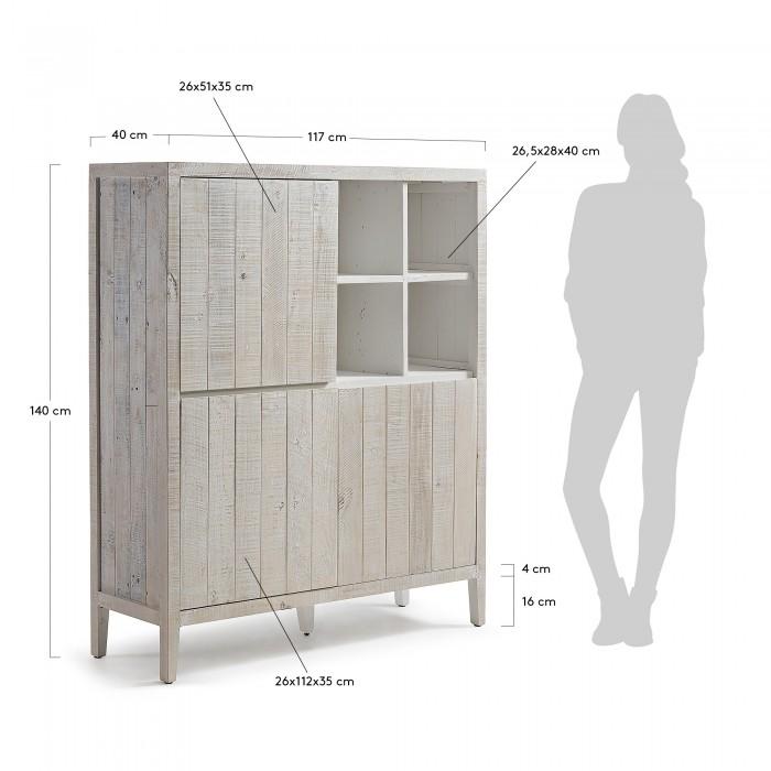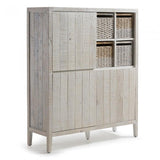 Aparador fabricado con madera de pino reciclado. Acabado envejecido con pintura aplicada a mano en color blanco patinado. Cajones de mimbre no incluidos.