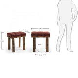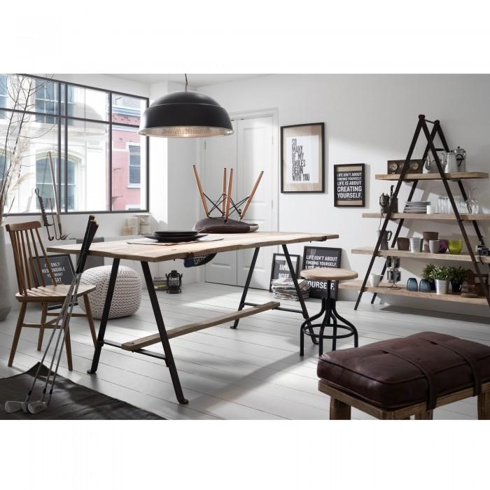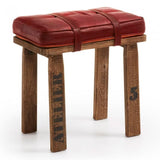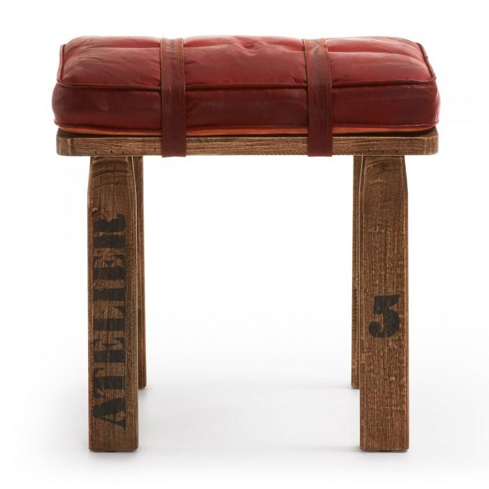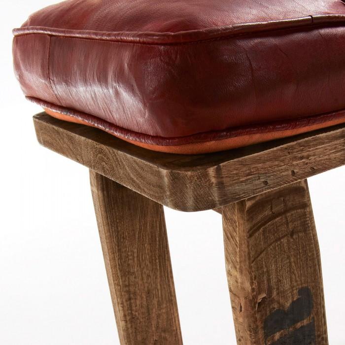 Banqueta de madera de mango natural con asiento de cuero auténtico en color marrón.