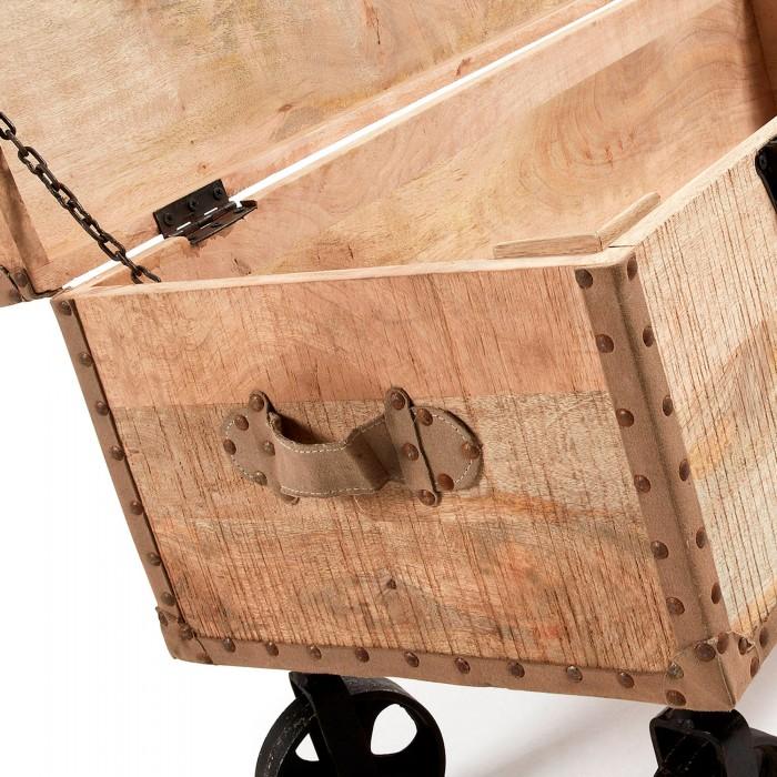Baúl en madera de mango con aplicaciones de cuero auténtico. Ruedas de hierro decorativas.