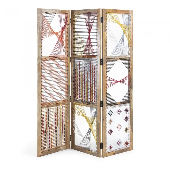 Biombo plegable con marco en madera de mango natural decorado con cuerda de algodón.