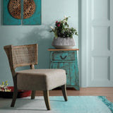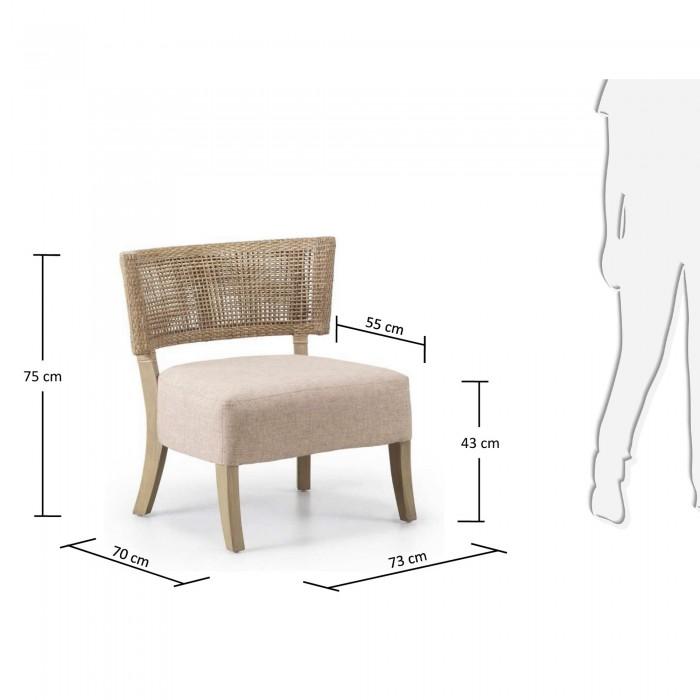 Sillón de madera con respaldo de ratán. Asiento tapizado en tela.