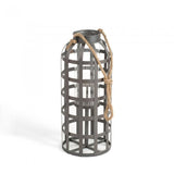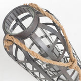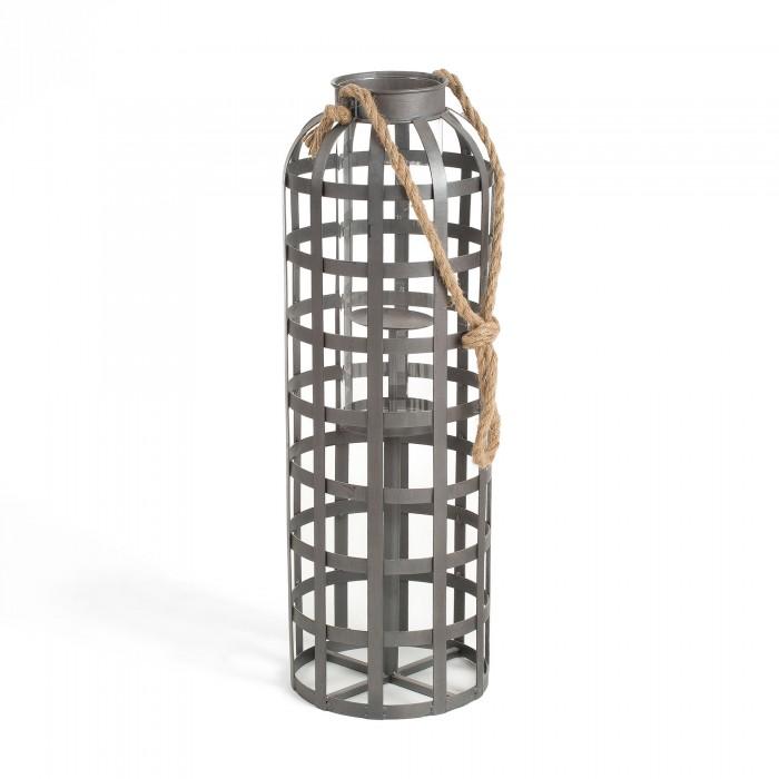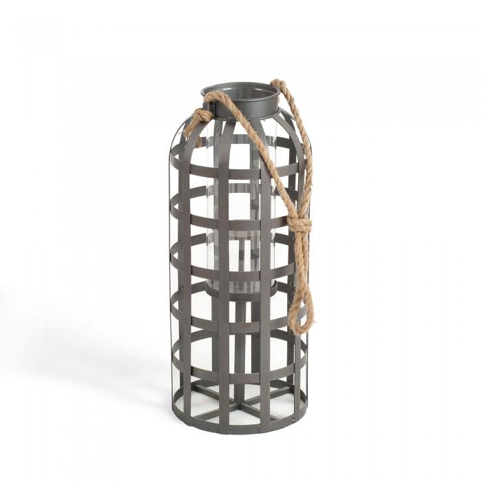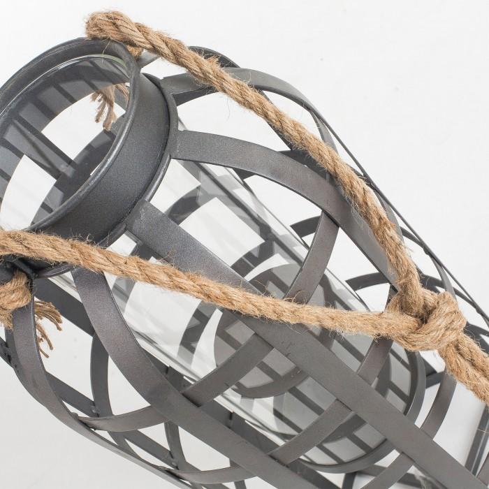 Candelero de metal con protector de cristal. Asa de cuerda.