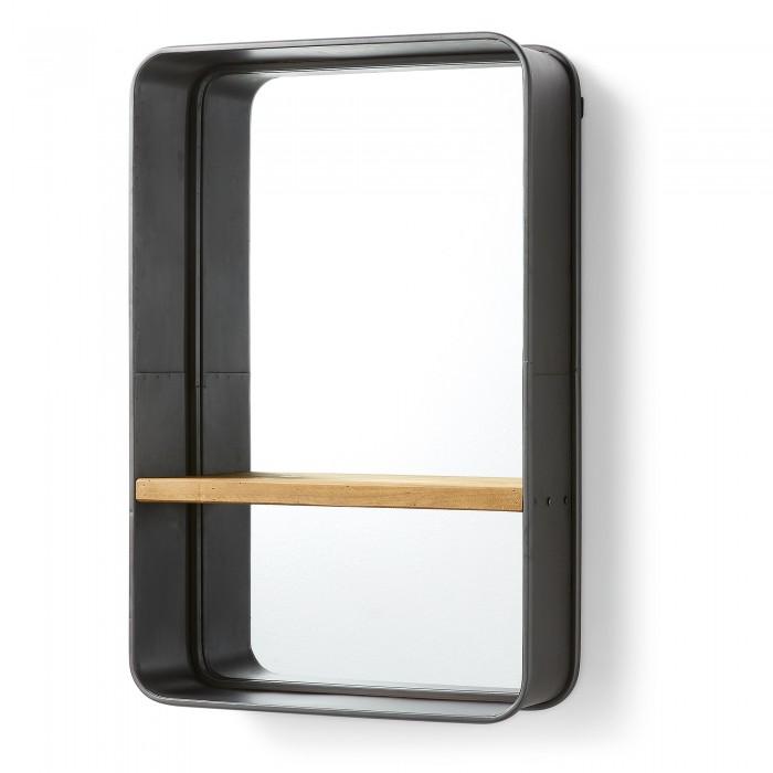 Espejo con marco de metal y estantería en madera de pino envejecido.