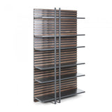 Estantería con trasera en chapa de nogal y estantes en DM lacado grafito mate. Pies de metal. Incluye sistema de fijación a la pared.