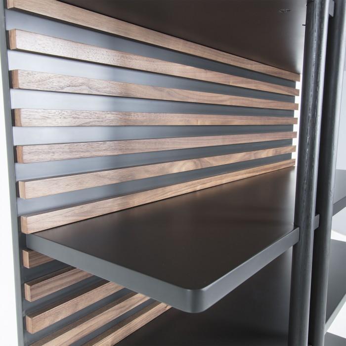 Líneas depuradas, limpias y rectas junto con el contraste del color grafito mate de la estructura de esta pieza con los frontales en nogal dan forma a esta estantería. Con un carácter indiscutible, este es un diseño con mucha fuerza que aúna sencillelez y modernidad que, sin duda, llamará la atención de todos tus invitados. Además, el cuidado de cada pequeño detalle y sus acabados denotan elegancia. ¡Una pieza perfecta para casas únicas!