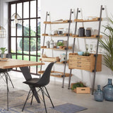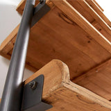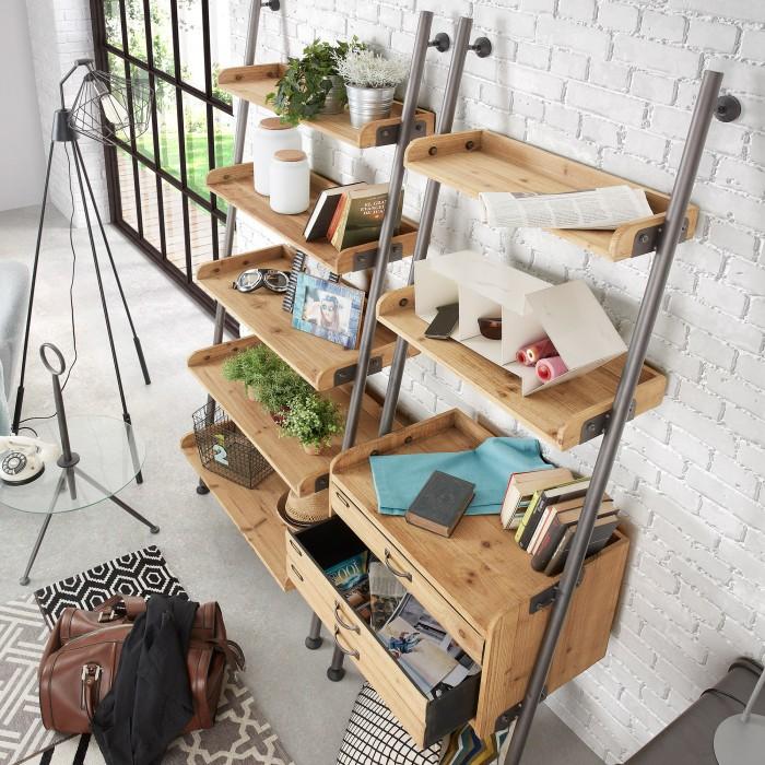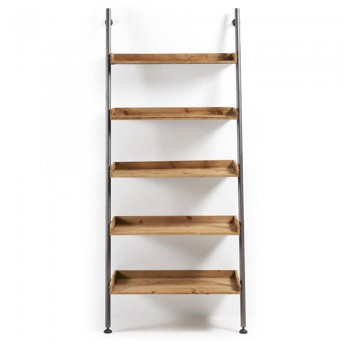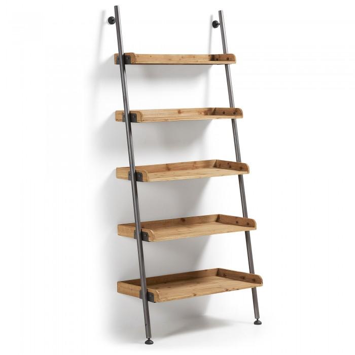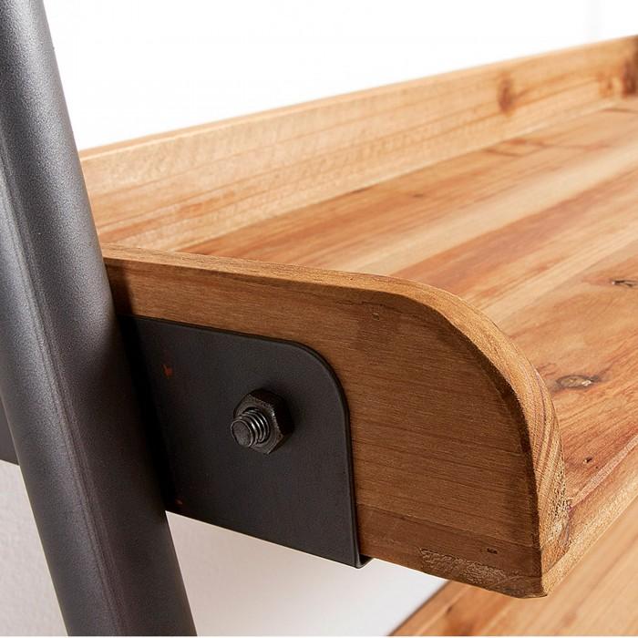 Estantería inclinada en madera de abeto envejecido y metal.
