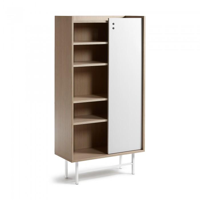 Estantería con estructura de chapa de roble natural. Puerta en DM lacado blanco mate. Pies en metal pintado.