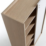 Estantería con estructura de chapa de roble natural. Puerta en DM lacado blanco mate. Pies en metal pintado.