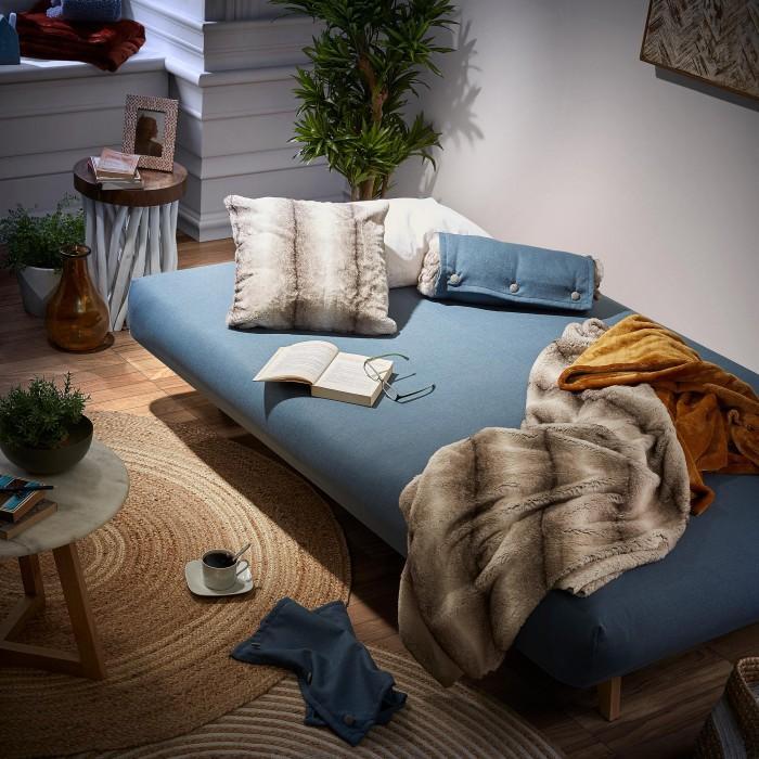 A simple vista puede parecer un cojín reposabrazos para el sofá, pero Roll es mucho más que eso. De hecho, es una manta enrollada en una funda con tres botones, detalle que no solo la hace más práctica, ya que así mientras no la uses estará siempre bien guardada, sino que multiplica su practicidad, haciendo que, enrollada, sea un confortable cojín a juego con los nuevos sofás Koki.