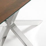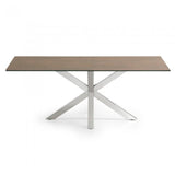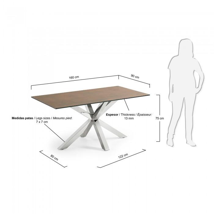 Mesa con sobre porcelánico técnico. Soporte de cristal. Acabado Iron Corten. Pies en acero inoxidable brillo.