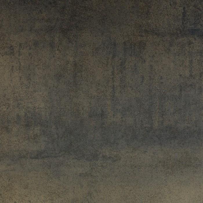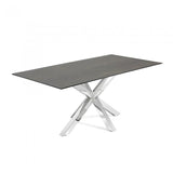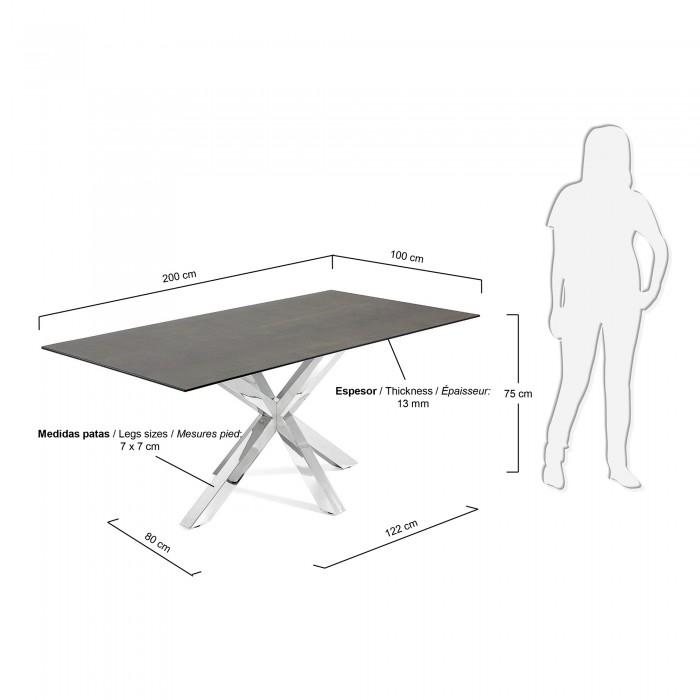Mesa con sobre porcelánico técnico. Soporte de cristal. Acabado Iron Moss. Pies en acero inoxidable brillo.