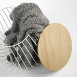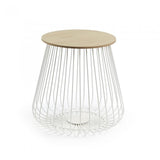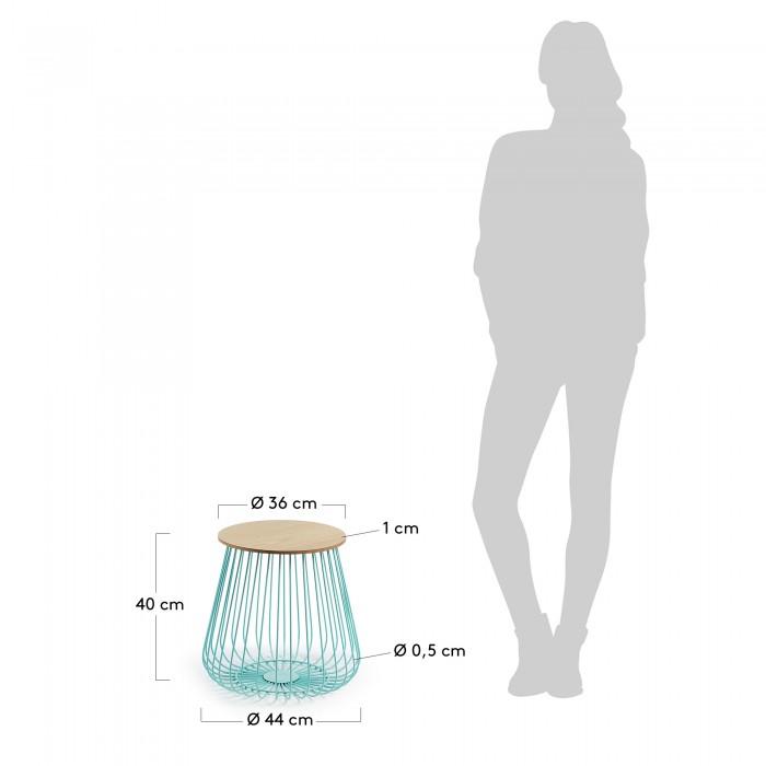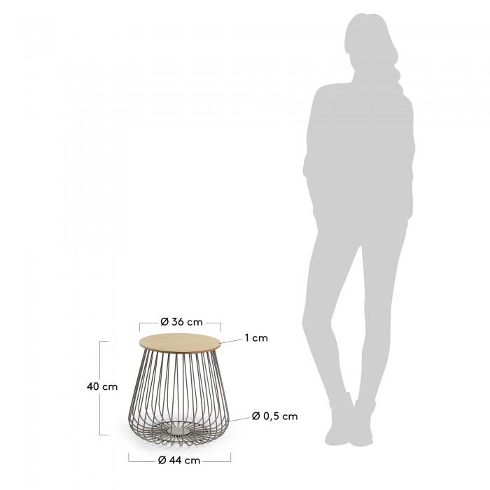 Mesa auxiliar con base de metal y sobre de madera natural.