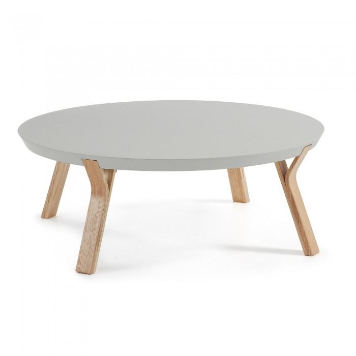 Mesa de centro redonda con estructura de madera de fresno y sobre en tablero de fibra de madera lacada mate.