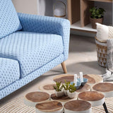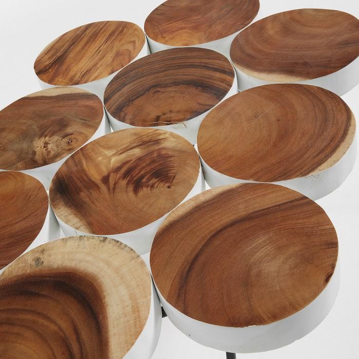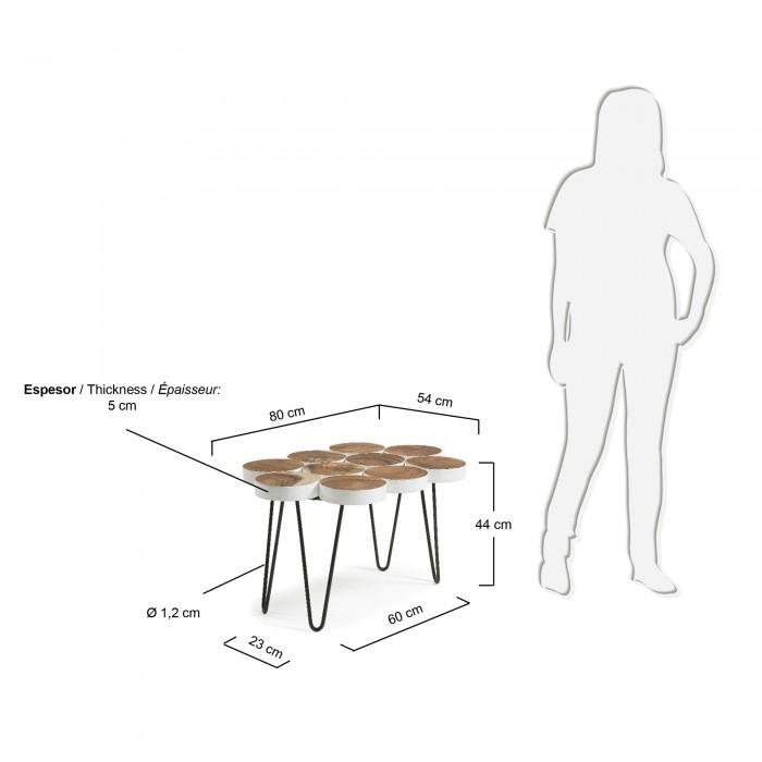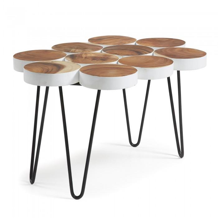 Mesa de centro con óvalos de madera de teca maciza. Pies de metal pintado.
