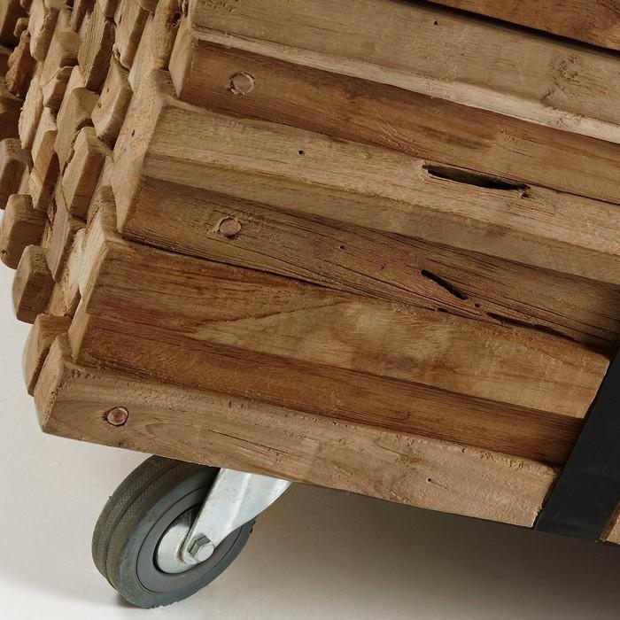 Esta mesa de centro sorprende por lo sencillo de su planteamiento en el diseño, ya que se compone de varias láminas de madera de teca natural sostenidas por cuatro robustas ruedas de metal.