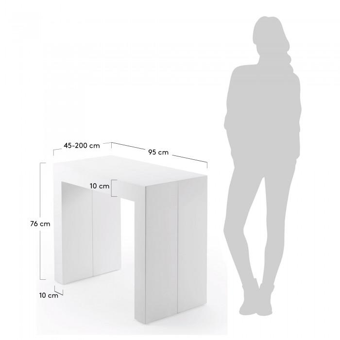 Mesa consola extensible en DM lacado mate. Longitud máxima 200 cm con 3 extensiones de 51 cm cada una. Incluye bolsa para guardar las extensiones.