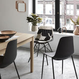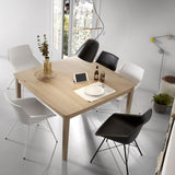La mesa Drake, elaborada en chapado de roble en tono mate, tiene unas dimensiones reducidas para encajar en cualquier espacio. Pero cuando se extiende por los laterales con su sistema mariposa se convierte en una mesa cuadrada de lo más original.