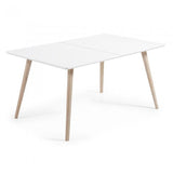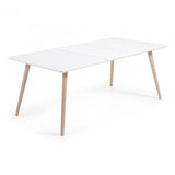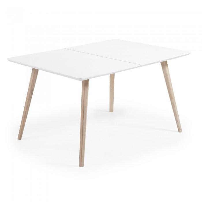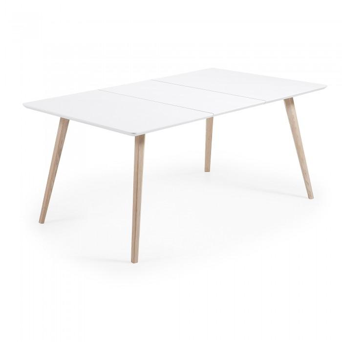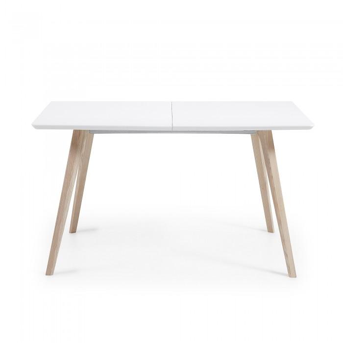 Mesa extensible con sobre de tablero de fibra de madera lacado blanco mate. Pies en madera maciza de fresno. Longitud máxima 220 cm. Incluye bolsa para extensiones.