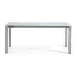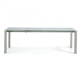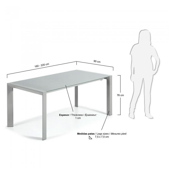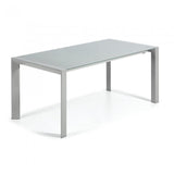 Mesa extensible con sobre en vidrio templado pintado gris y extensión en DM lacado brillante. Estructura de acero pintada en epoxy gris. Longitud máxima 220 cm.