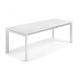Mesa extensible con sobre en vidrio templado pintado blanco Estructura de acero pintada en epoxy blanco. Longitud máxima 230 cm.