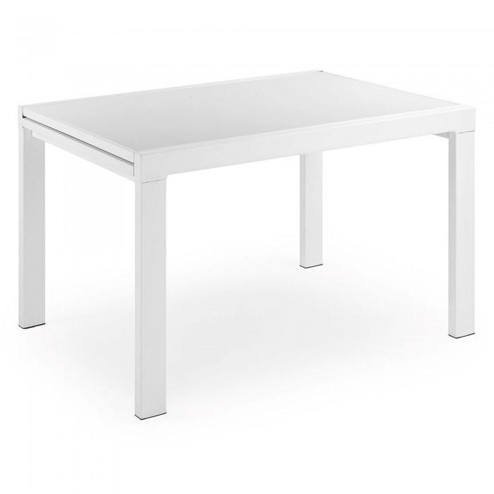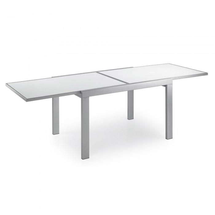 Mesa extensible con estructura de acero pintado en epoxy y sobre en cristal templado. Longitud máxima 180 cm.