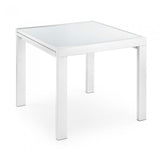 Mesa extensible con estructura de acero pintado en epoxy y sobre en cristal templado. Longitud máxima 180 cm.