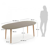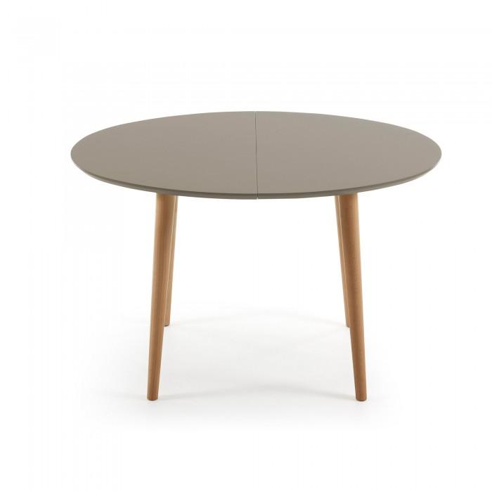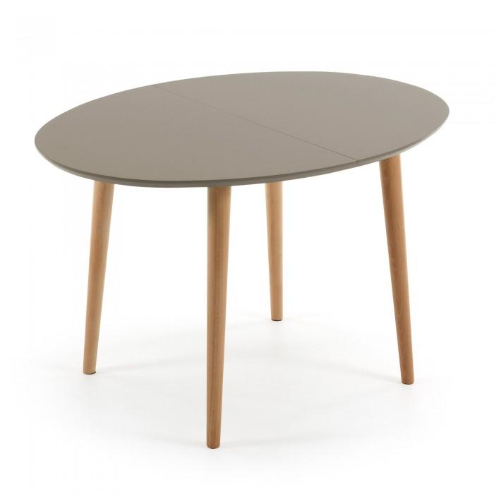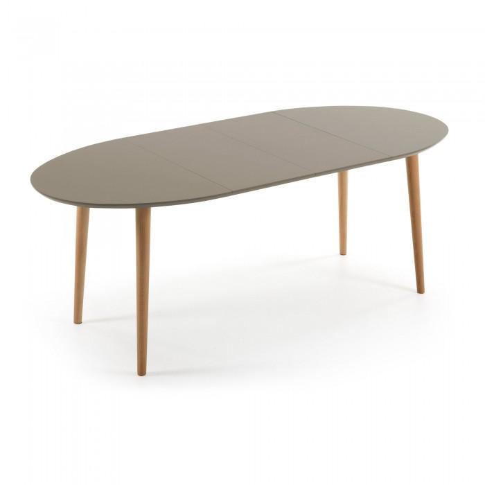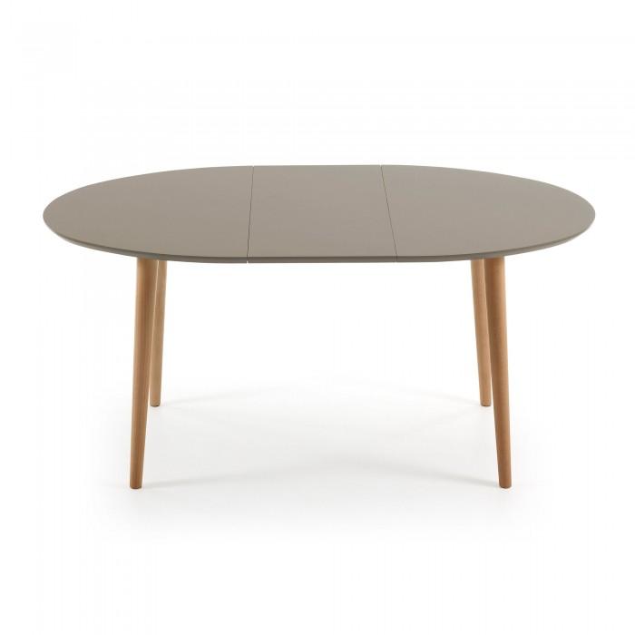 Mesa extensible ovalada con sobre de DM lacado en color topo mate. Pies en madera de haya natural barnizada. Longitud máxima 200 cm. Incluye bolsa para extensiones.