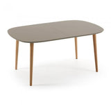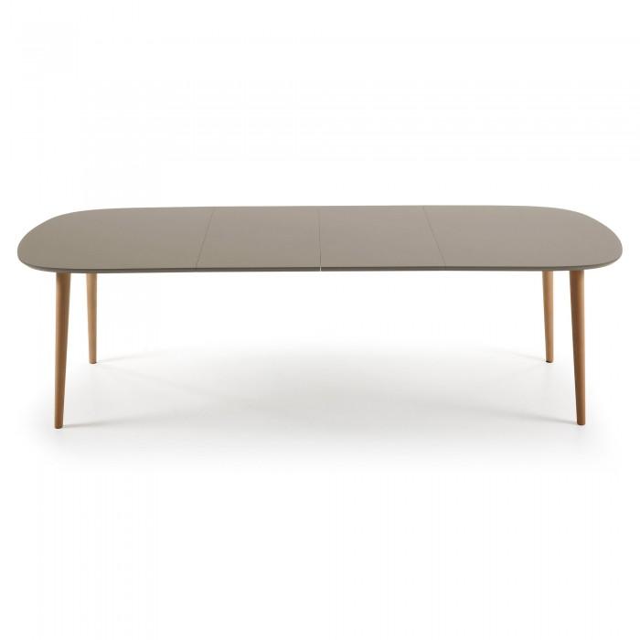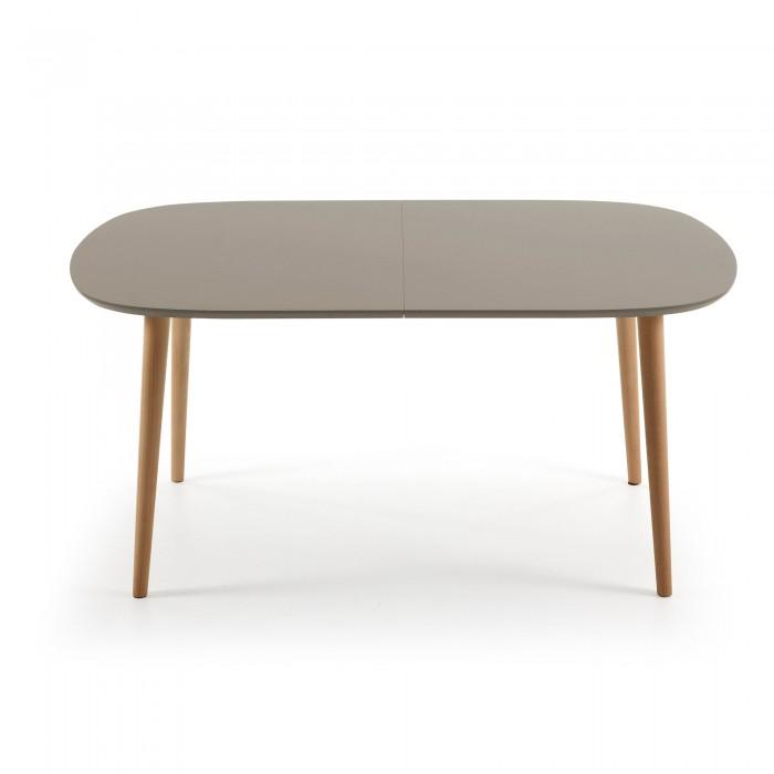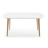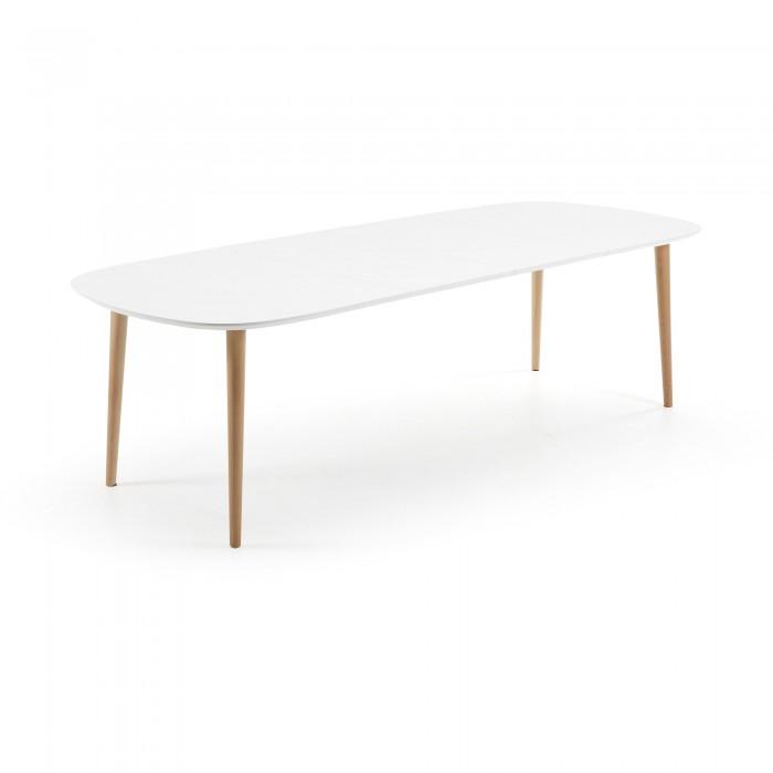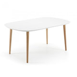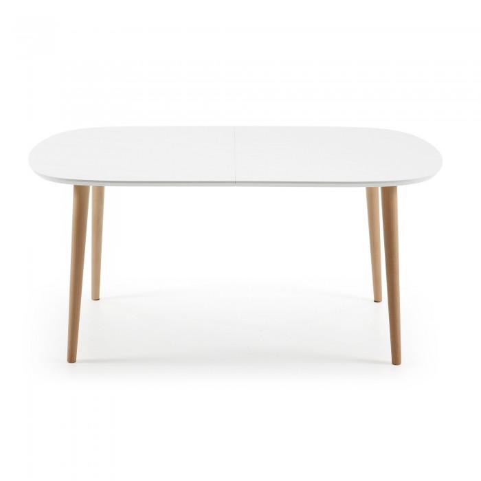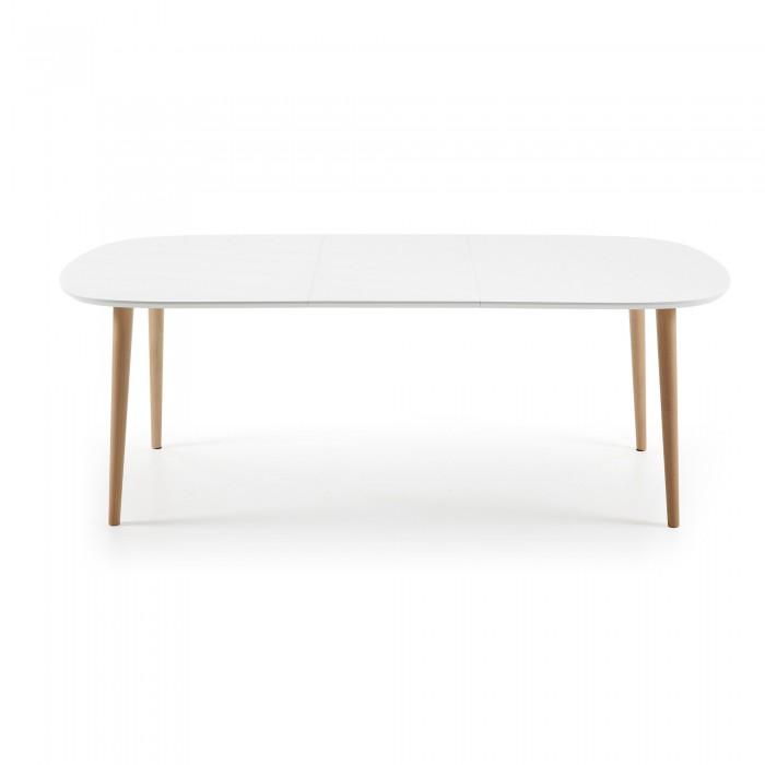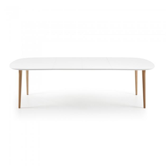 Mesa extensible ovalada con sobre de DM lacado en blanco mate. Pies en madera de haya natural barnizada. Longitud máxima 260 cm. Incluye bolsa para extensiones.