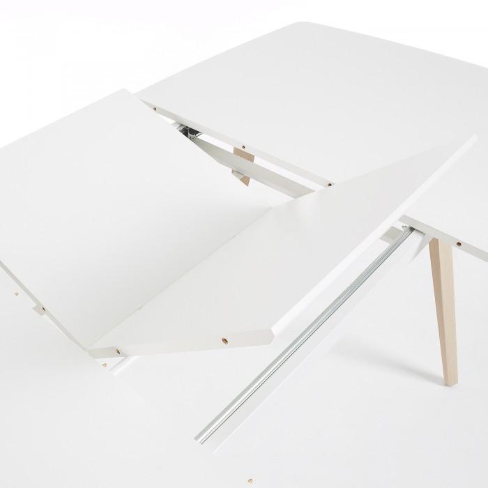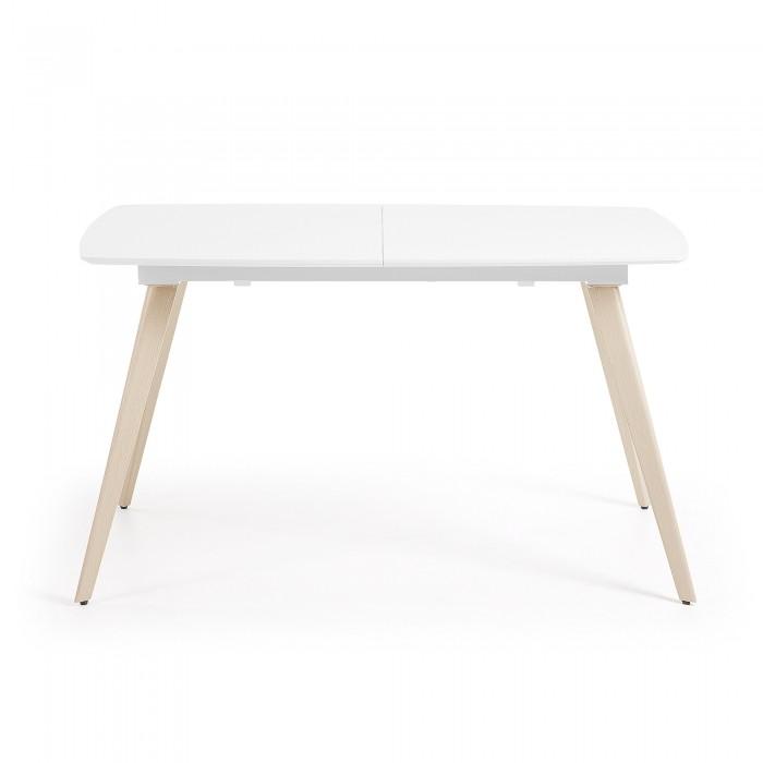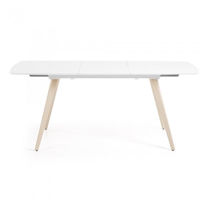 Mesa extensible con sobre de DM lacado blanco mate. Pies en acero efecto madera. Longitud máxima 160 cm.