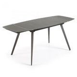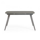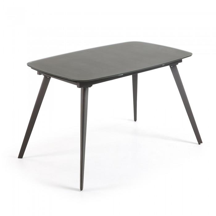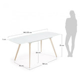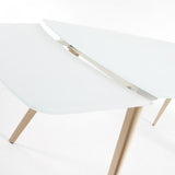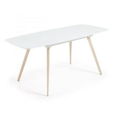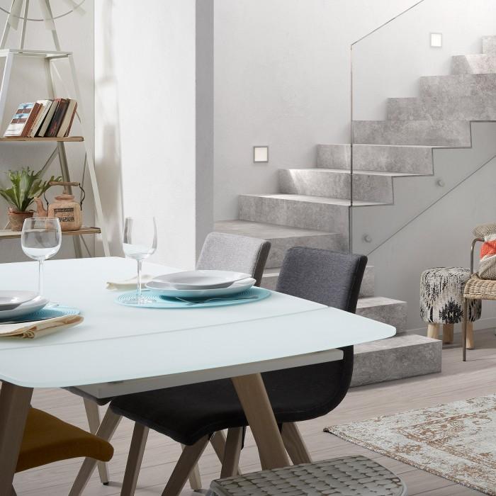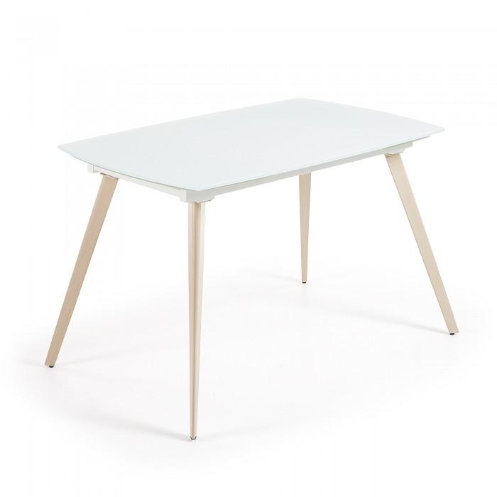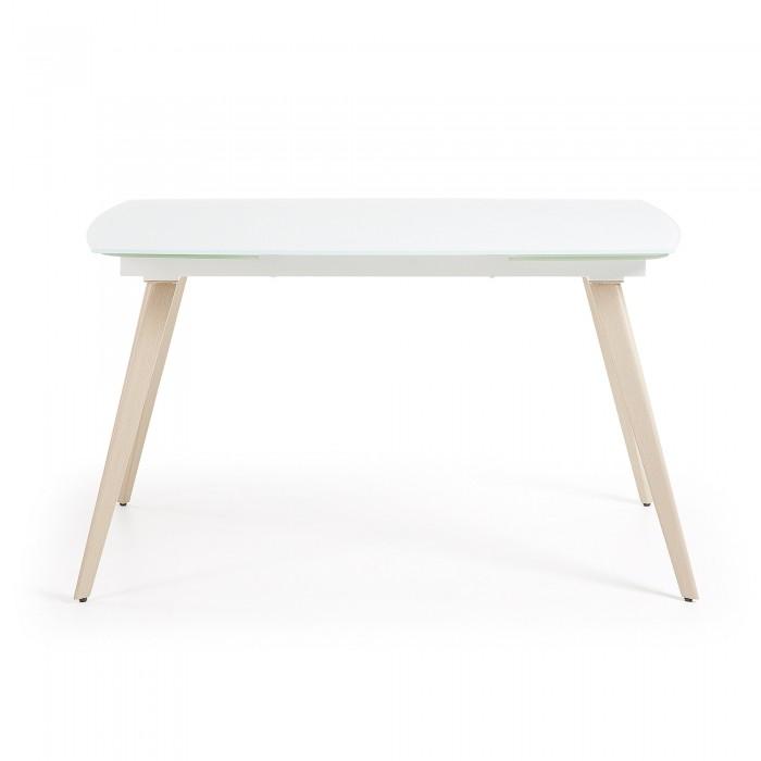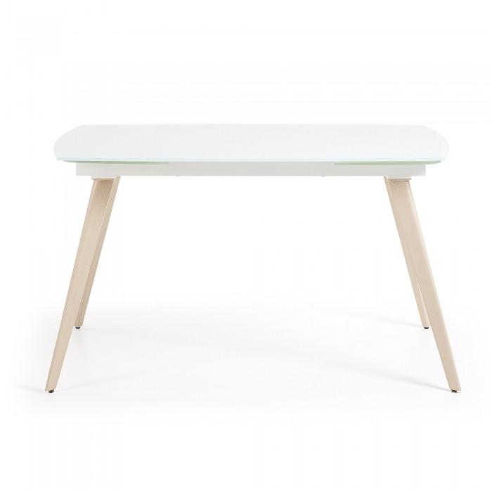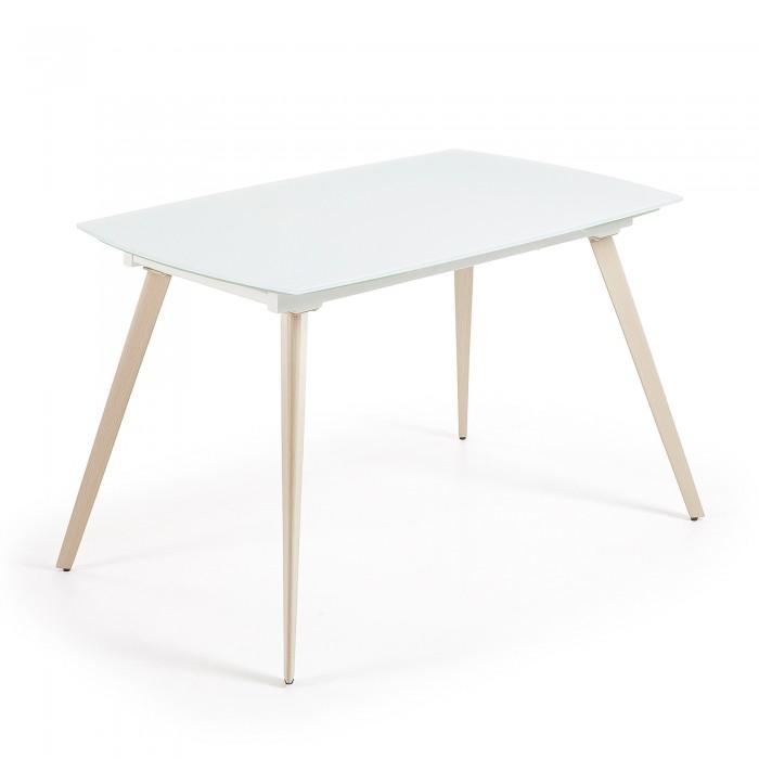 Mesa extensible con sobre de cristal óptico templado blanco mate. Pies en acero efecto madera. Longitud máxima 180 cm.