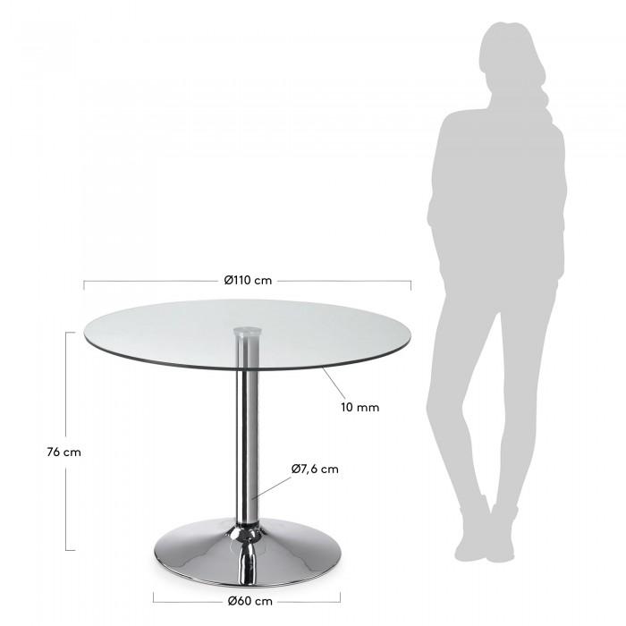 Mesa redonda con pies de acero cromado. Sobre en cristal templado. Grueso del cristal 10 mm.