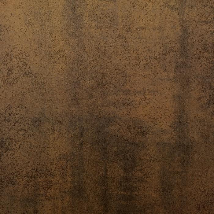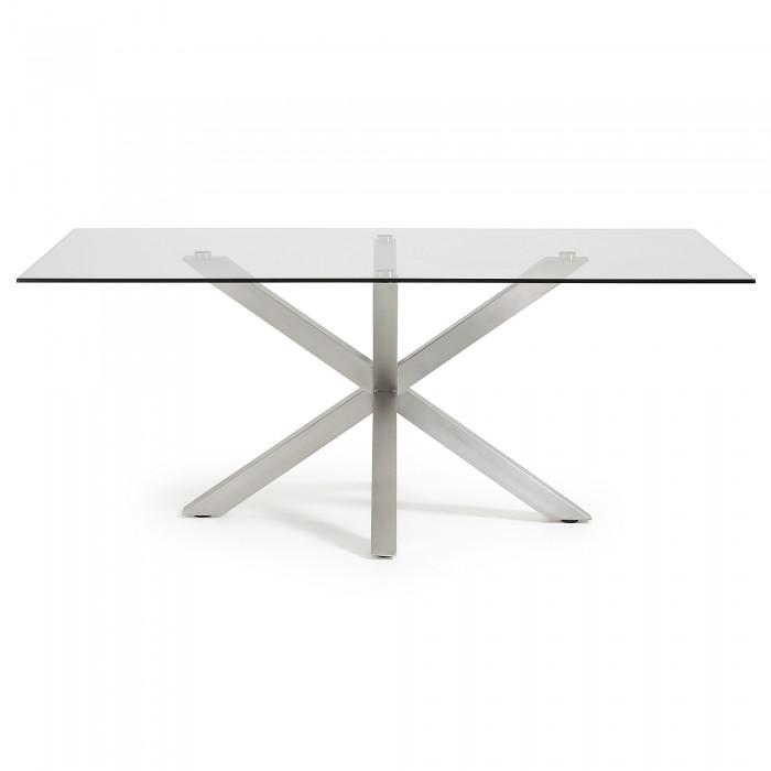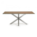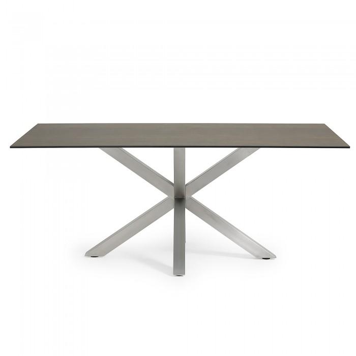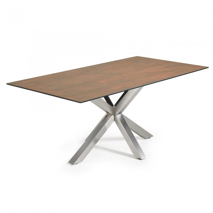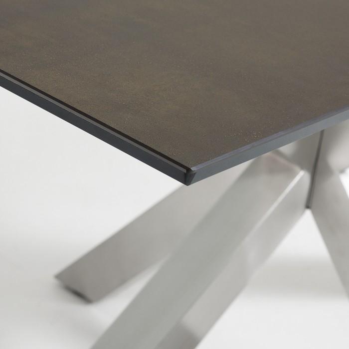 Mesa con pies de acero inoxidable mate y sobre porcelánico técnico con soporte de cristal. Acabado iron corten.
