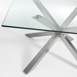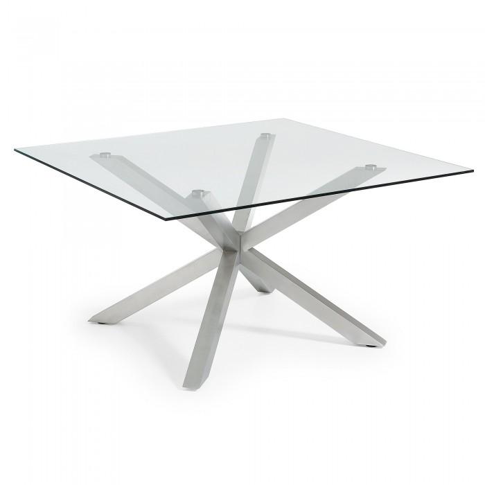 Mesa con pies de acero inoxidable mate y sobre en cristal templado.