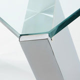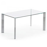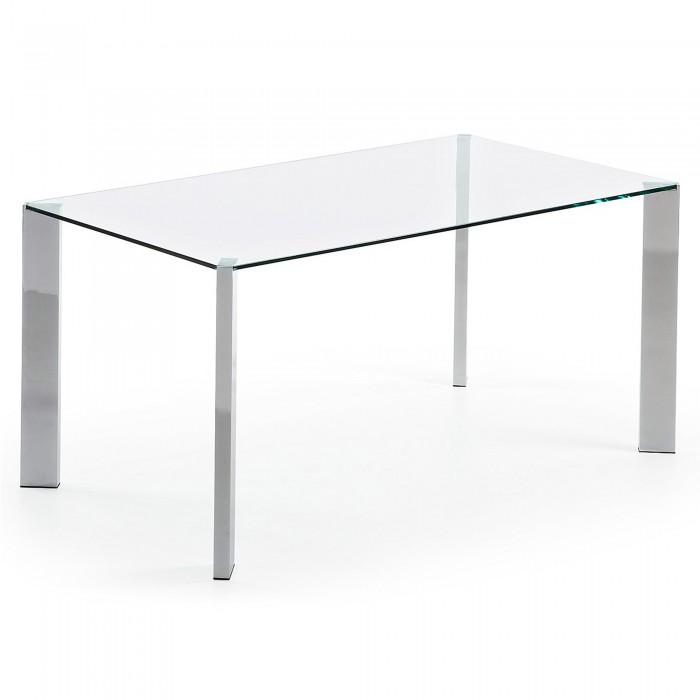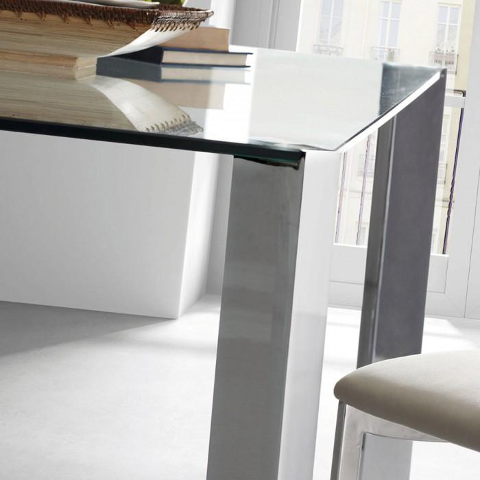 Mesa con pies de acero cromado y sobre en cristal templado transparente.