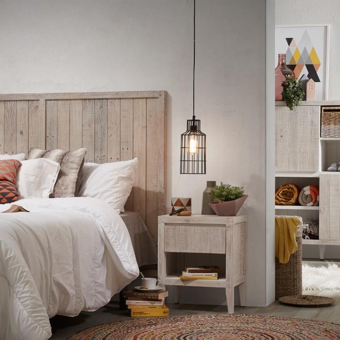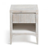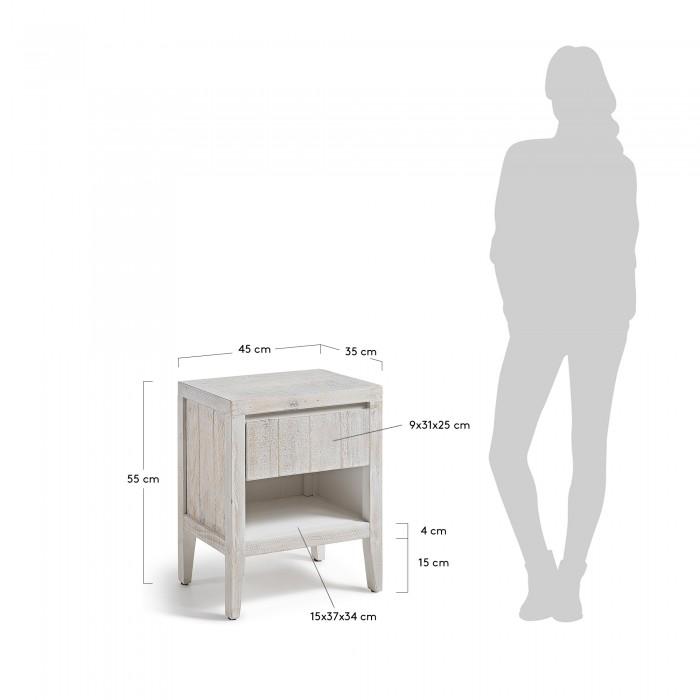 Mesita de noche fabricada con madera de pino reciclado. Acabado envejecido con pintura aplicada a mano en color blanco patinado.