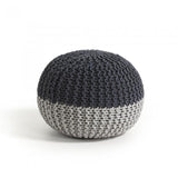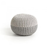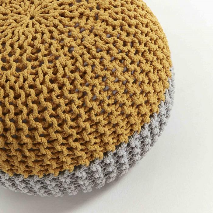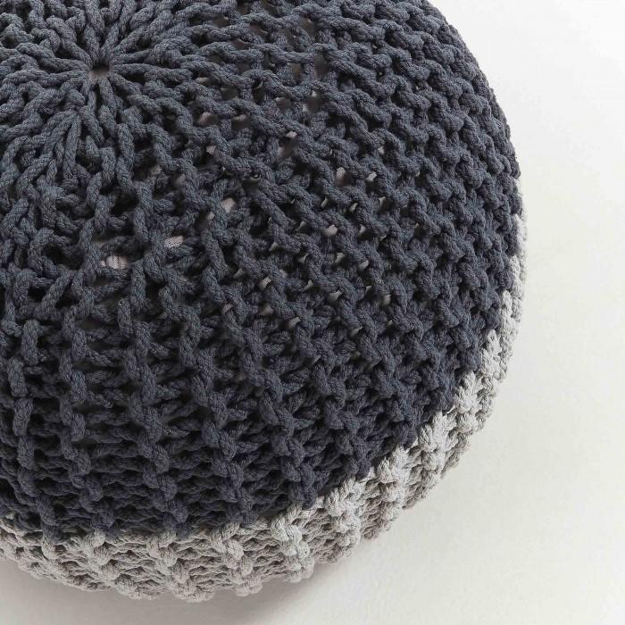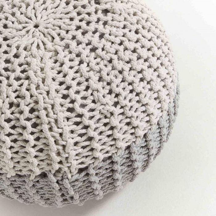 Puf redondo con funda tricotada en algodón (no desenfundable) y relleno de poliestireno expandido.