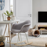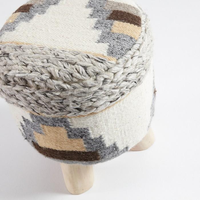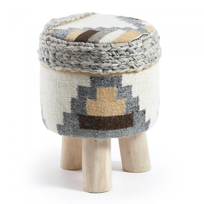 Taburete con pies de madera de eucalipto. Asiento en tela de lana.