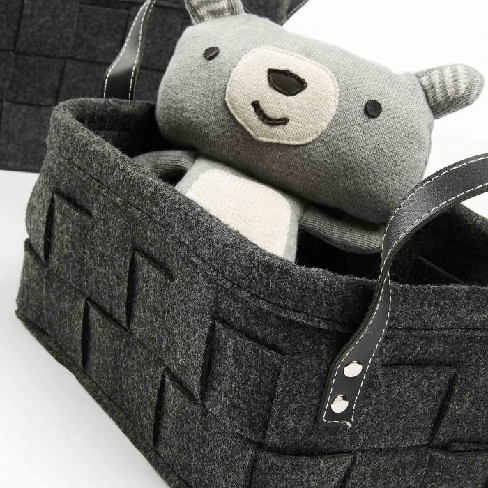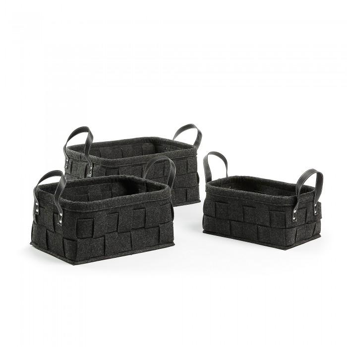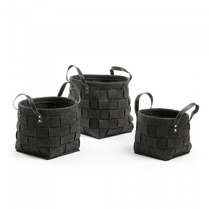 Set de 3 cestos de fieltro con asas en piel sintética.