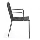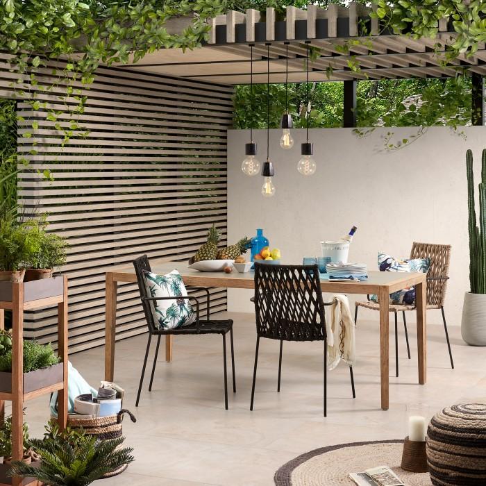 Elaborada en acero galvanizado y cuero sintético trenzado, esta silla evoca al buen tiempo y a tardes de verano.
