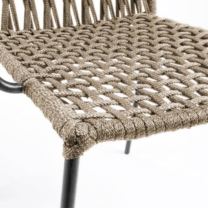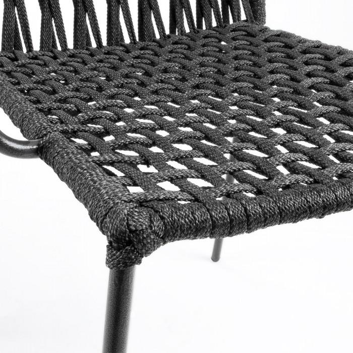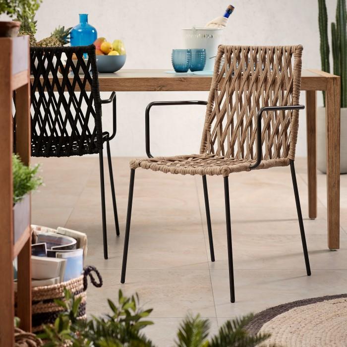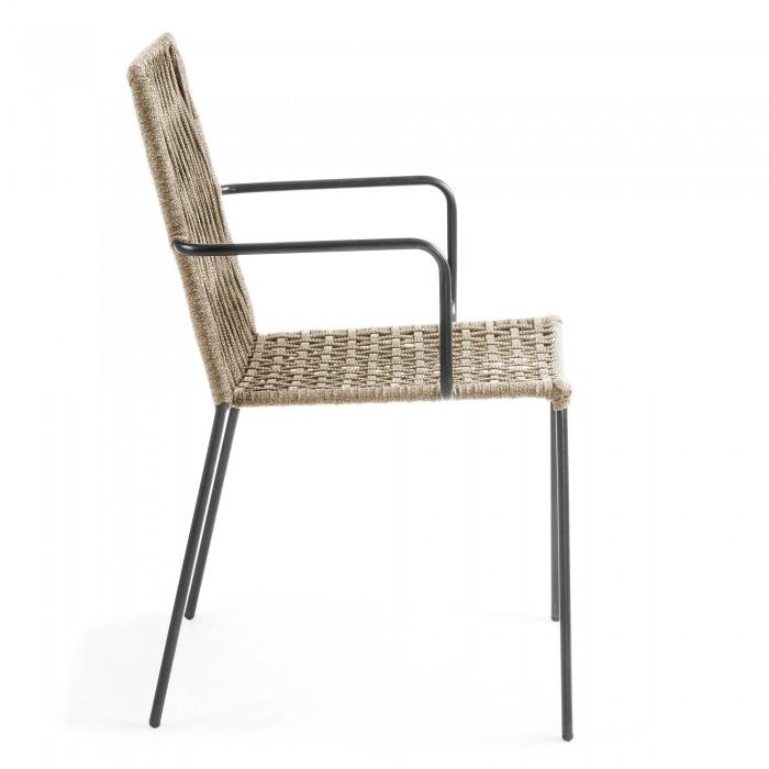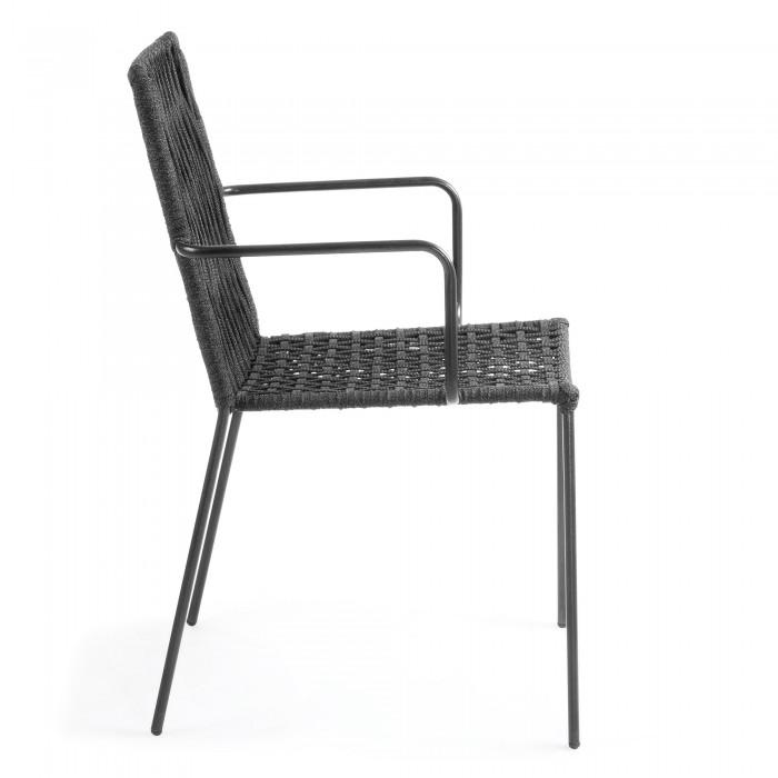 Silla con brazos. Estructura en acero galvanizado pintado por pulverización. Asiento y respaldo en cuerda de poliester resistente a los rayos UV. Apilable. Para uso interior y exterior bajo techo.