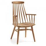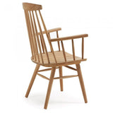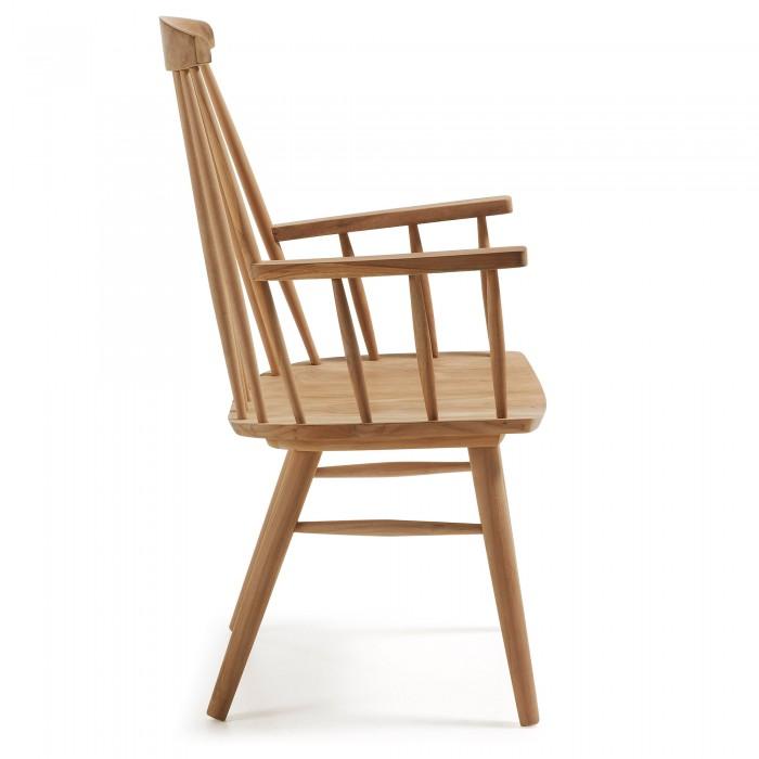 Silla con brazos de madera maciza de teca en acabado natural.