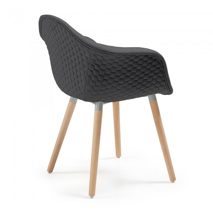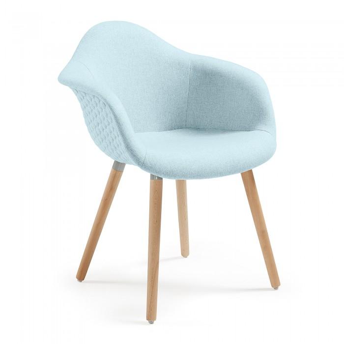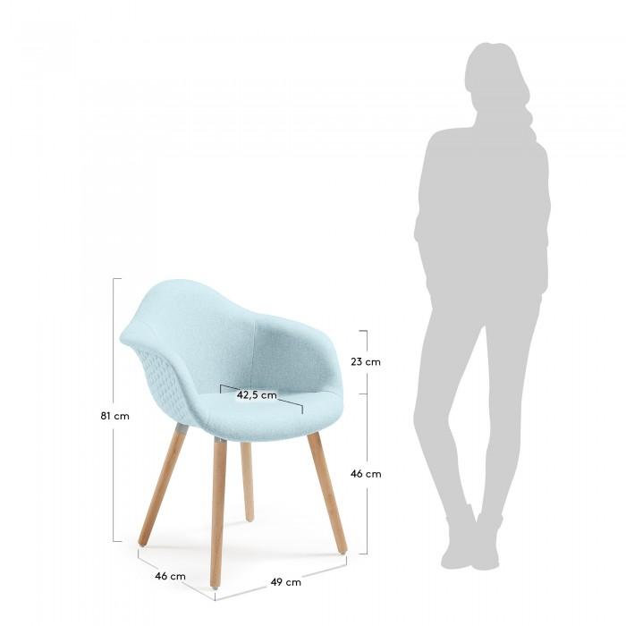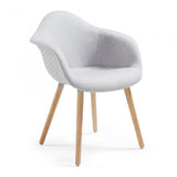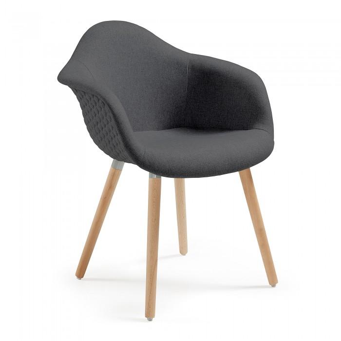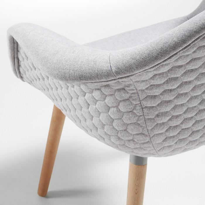 Silla con brazos. Tapizada en tela, parte posterior del asiento en acolchado. Pies en madera maciza de haya.