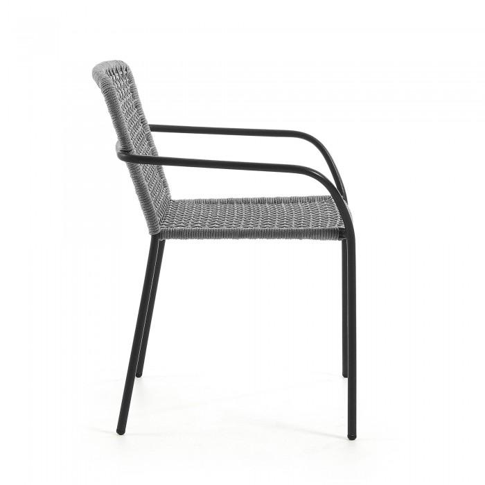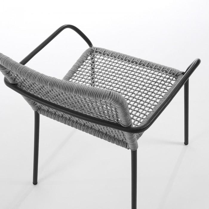 Silla con brazos. Estructura en acero galvanizado pintado por pulverización. Asiento y respaldo en cuerda de poliester resistente a los rayos UV. Para uso interior y exterior bajo techo.