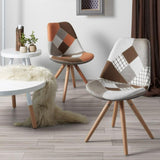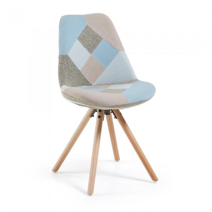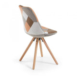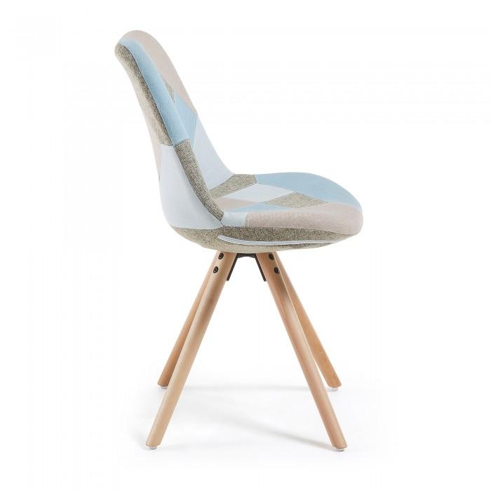 Silla tapizada en patchwork multicolor. Pies en madera de haya natural. Pueden existir pequeñas variaciones en la combinación de las telas.