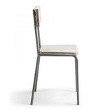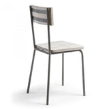 Silla con estructura de metal en color natural barnizado. Asiento y respaldo en madera de pino, acabado envejecido con pintura aplicada a mano en color blanco patinado.