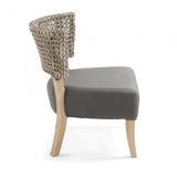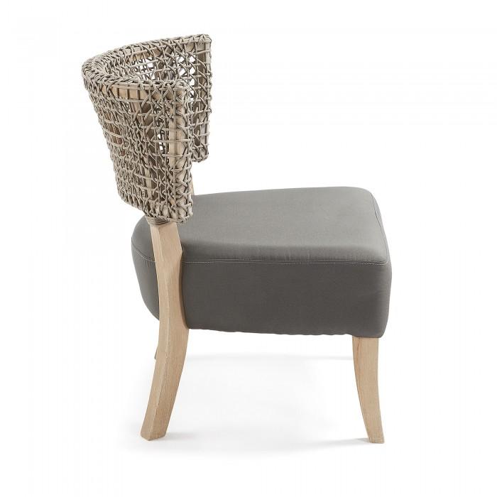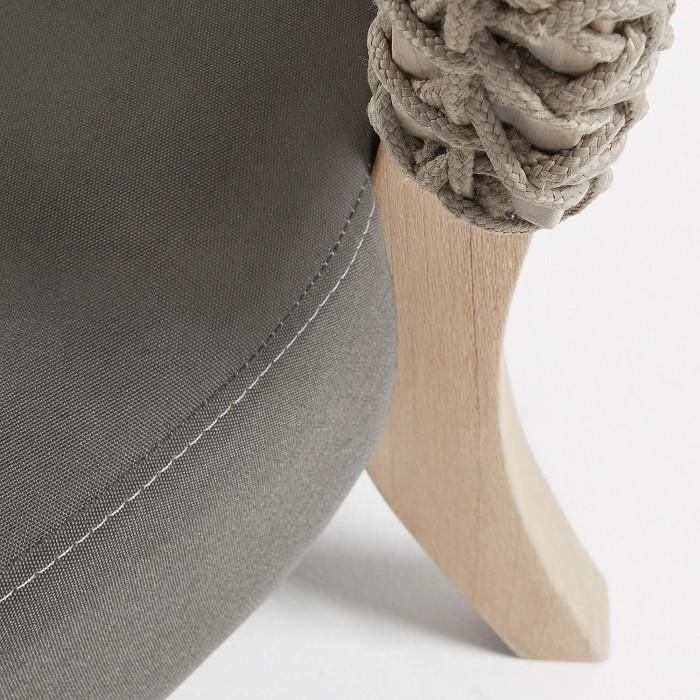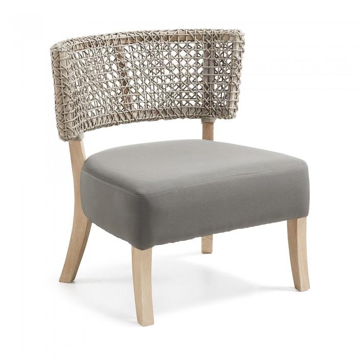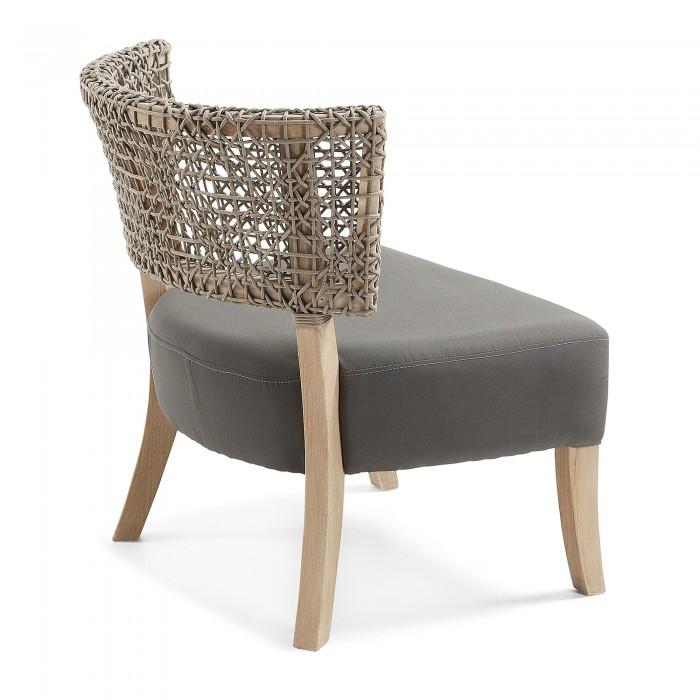 Sillón con estructura de madera de teca maciza en acabado natural. Asiento tapizado con tela. Respaldo con cuerda de poliester.