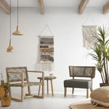 De aires étnicos y con reminiscencias naturales, este sillón con estructura de madera de teca maciza, asiento tapizado en tela y respaldo hecho con cuerda de poliéster es perfecto para crear un rincón con encanto.