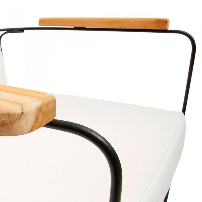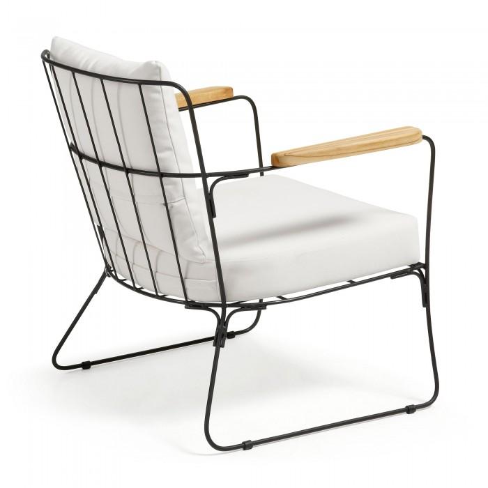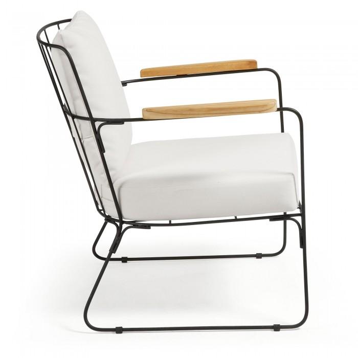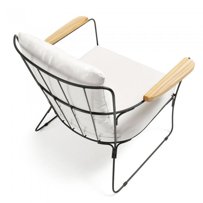 Sillón con estructura de metal pintada en negro y reposabrazos de teca natural. Cojines desenfundables tapizados en algodón crudo.