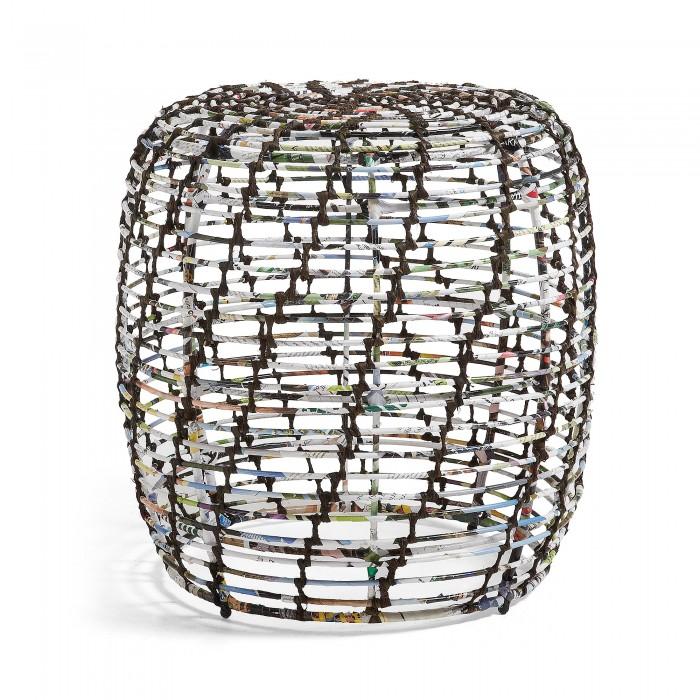 Taburete con marco de hierro pintado. Recubrimiento de papel reciclado con capa de barniz.